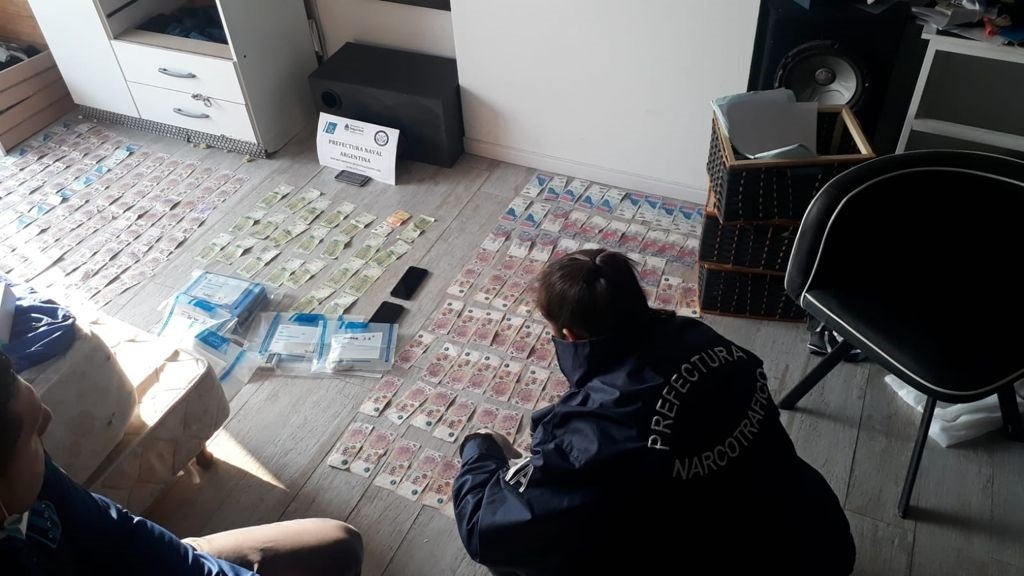 Los detenidos eran seis hombres y una mujer, todos argentinos, y entre los elementos secuestrados había 74.160 pesos, 18.560 dólares, balanzas de precisión, teléfonos celulares, una moto y documentación de interés para la causa.