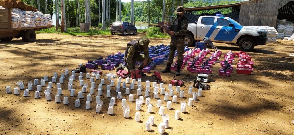 Además, en la zona lindera a los galpones, se encontró, oculto entre la espesa vegetación, 98 rollos de hilos de coser, zapatillas, una máquina de contar billetes, un disco rígido externo, un motor fuera de borda, siete máquinas de coser y un arma de fuego.