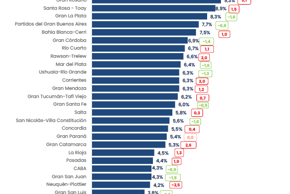 Los grandes aglomerados urbanos, donde se concentra la mayor parte de la actividad económica, exhiben una desocupación más alta que las ciudades chicas. Algunos casos son alarmantes. Río Gallegos lidera el ranking de desocupación con 10,8%, casi ocho puntos más que en 2023. Gran Resistencia ronda el 10%. Gran Rosario trepó al 8,9% por un fuerte aumento de la oferta laboral que el tejido productivo no logró absorber.