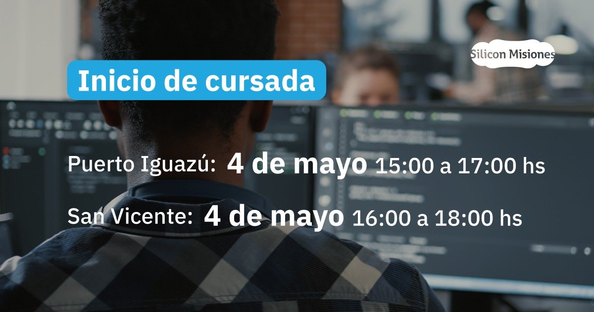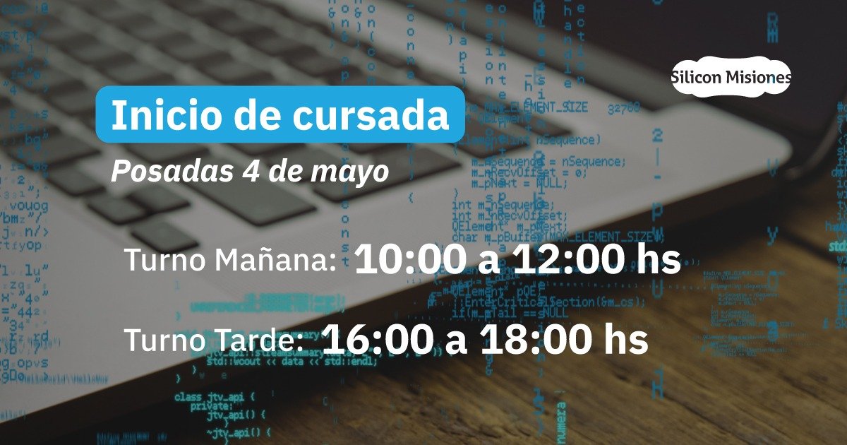 En Posadas: habrán 2 comisiones que cursarán en la sede centro de Silicon Misiones ubicada en San Lorenzo 2023, la primer comisión tendrá clases los días miércoles por la mañana, de 10 a 12 hs y la segunda comisión los días miércoles de 16 a 18 hs.