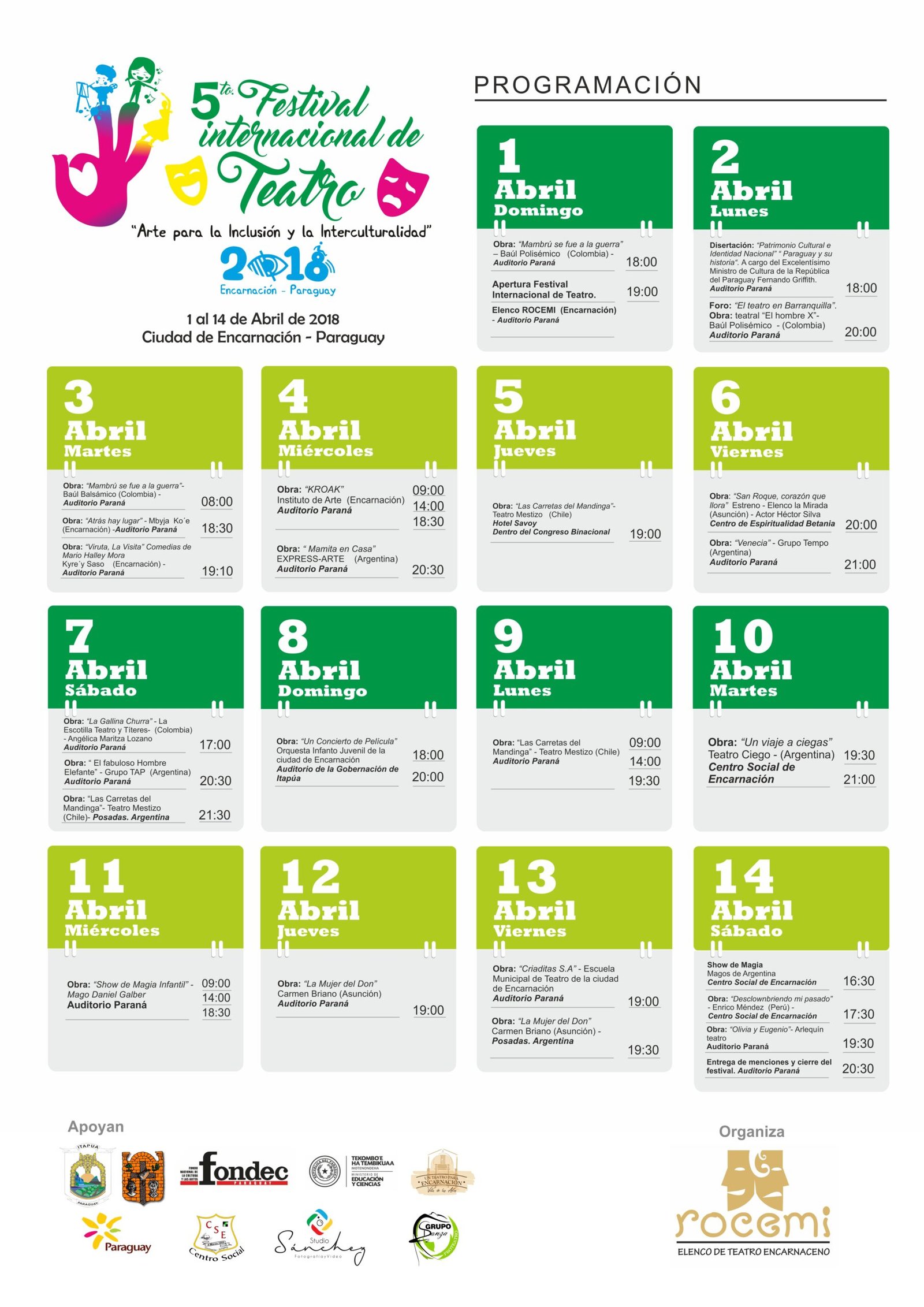 El Primer Festival Internacional de Teatro “Posadas 2019” se inició el 5 de abril y continúa hasta el 20, organizado por el grupo de teatro Agua de Río y con epicentro en Sala Tempo. Se afianza la tradición de intercambios con el Festival de Encarnación, que ya va por su sexto año