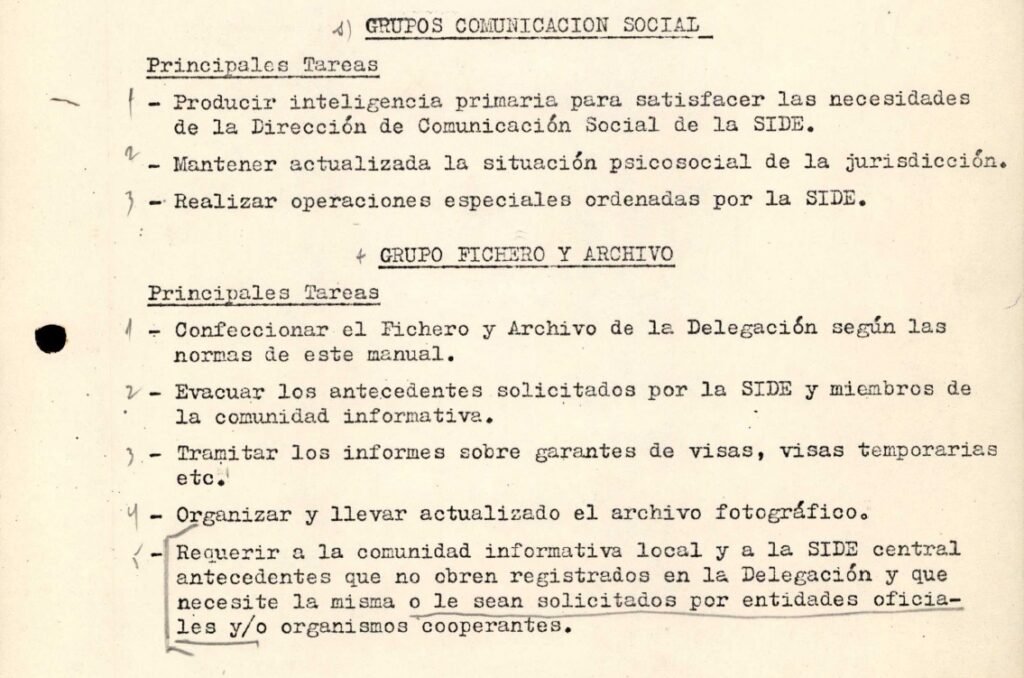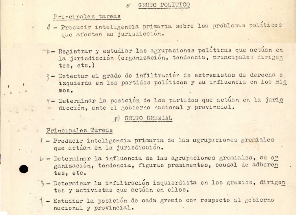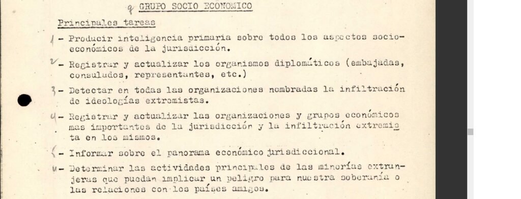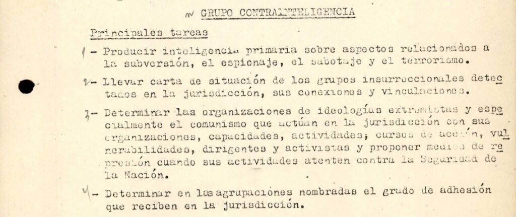 El informe también identifica la ejecución de directivas de Acción Sicológica destinadas a neutralizar la propaganda de las Organizaciones Político Militares. Esa tarea incluía el control de medios de difusión locales y la elaboración de informes sobre el “clima social” para orientar decisiones del gobierno militar en la provincia.
