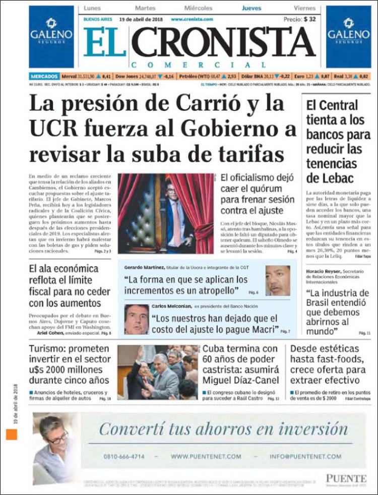 Lo principal es que pese a los reclamos de la oposición, y tras el ruidazo de ayer, el Gobierno no dará marcha atrás con los incrementos de la tarifa del gas y otros servicios públicos. La novedad es que se habilitará la posibilidad de pagar en cuotas las facturas de los meses de mayor consumo en los de menos… pero con intereses.