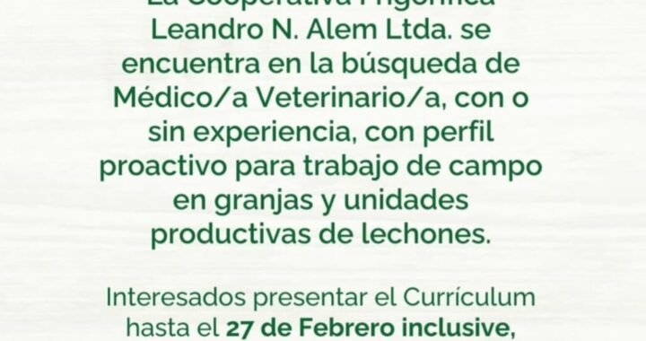 La Cooperativa Frigorífica Leandro N. Alem Ltda. (Cofra) abrió una convocatoria laboral para incorporar un médico o médica veterinaria, con o sin experiencia, para desempeñarse en trabajo de campo en granjas y unidades productivas de lechones.