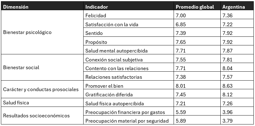 El informe muestra que los adultos argentinos presentan niveles superiores al promedio internacional en dimensiones vinculadas al bienestar psicológico, las relaciones sociales y el carácter prosocial. Sin embargo, el país queda rezagado en dos variables clave: estabilidad económica y condiciones materiales, lo que refleja mayores niveles de preocupación por los ingresos y la seguridad financiera.