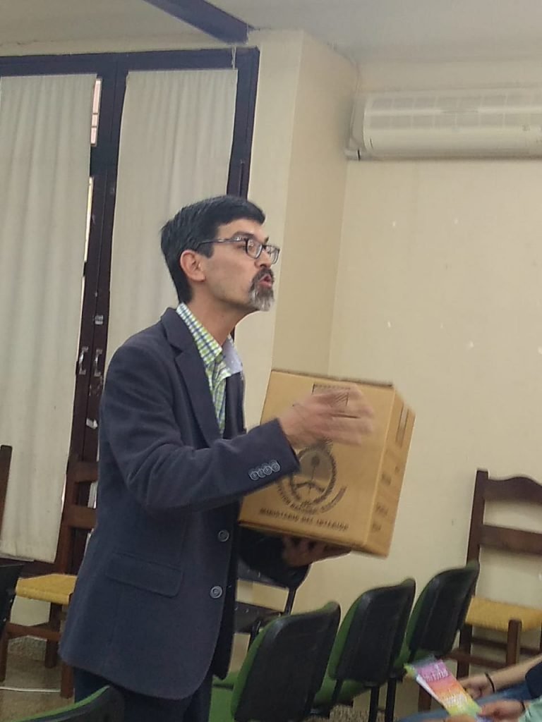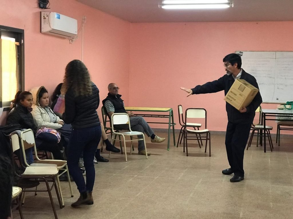 Explicó que a partir de un convenio de colaboración con el Tribunal Electoral provincial llevan material informativo (folleteria) sobre el sistema electoral y a la vez tienen una urna (usada y con todos los requerimientos legales como ser las fajas y precintos), con la cual hacen un simulacro de lo que son los comicios.