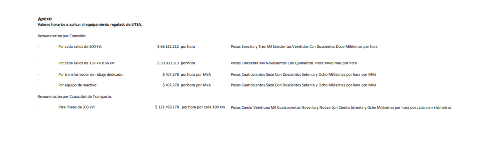 En ese contexto, el organismo regulador aprobó los valores horarios a aplicar al equipamiento regulado de LITSA, detallados en el anexo de la resolución, que incluyen remuneraciones por conexión y por capacidad de transporte, con montos expresados en pesos por hora según nivel de tensión y tipo de equipamiento.