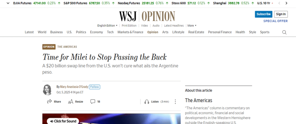 Bajo el título “Es hora de que Milei deje de echar culpas”, la columnista del diario financiero The Wall Street Journal Mary Anastasia O’Grady reitera la posición del medio de que Javier Milei debe dolarizar para resolver los problemas económicos de la Argentina y analiza el contexto de su gobierno en medio de las negociaciones con la Administración Trump por una paquete de ayuda financiera.