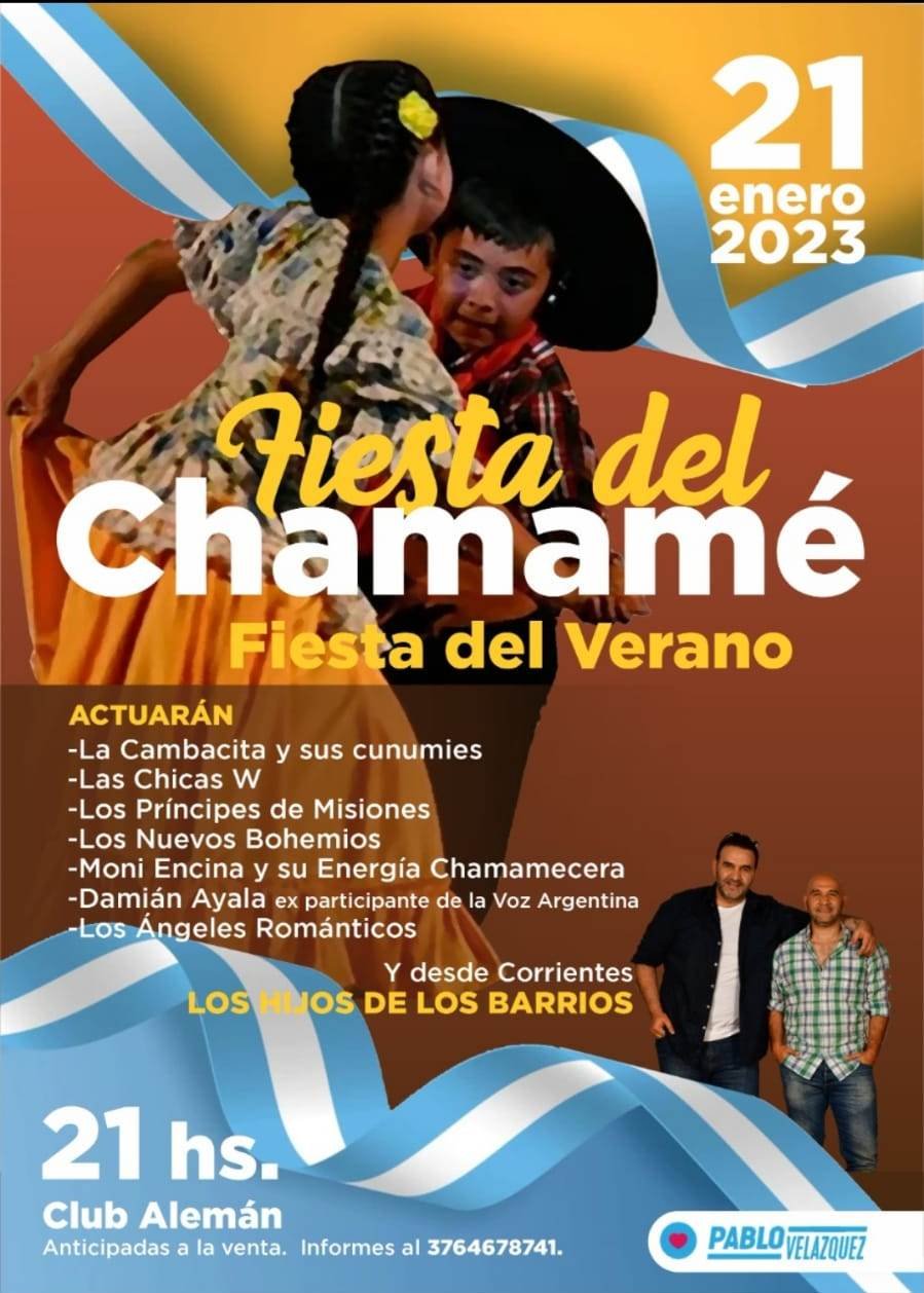 Este sábado a las 21:00 horas, en el Club Alemán (Av. Corrientes 3300) de la ciudad capital, los amantes del chamamé tienen una cita impostergable, ya que se estará llevando a cabo la décima edición de la “Fiesta del chamamé – fiesta del verano”.Contará con importantes conjuntos misioneros y de la región, que tendrá como broche de oro, la actuación del conjunto correntino Los hijos de los Barrios. Habrá servicio de cantina.