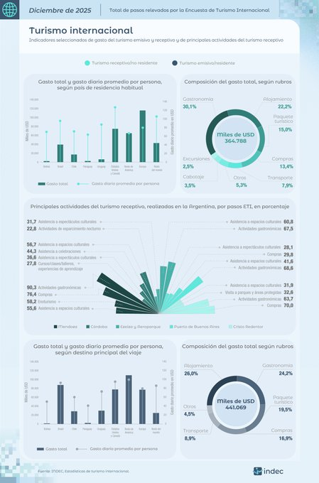 Como resultado, diciembre cerró con un saldo negativo de 389.900 visitantes internacionales, explicado por un déficit de 169.300 turistas y 220.600 excursionistas. En términos de gasto, durante ese mes los visitantes que arribaron al país gastaron USD 364,8 millones, mientras que quienes viajaron al exterior erogaron USD 441,1 millones, profundizando el rojo mensual.