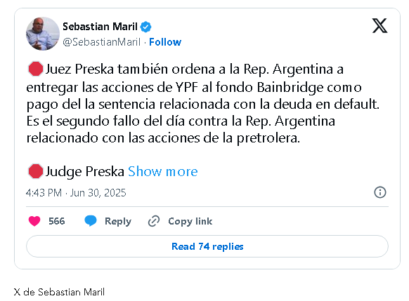 “En un segundo fallo emitido el mismo día, la jueza federal de distrito Loretta Preska ordenó a la República Argentina transferir sus acciones de YPF al fondo Bainbridge como pago parcial de una sentencia separada relacionada con deuda soberana en default. Esto marca la segunda decisión adversa en un solo día relacionada con la participación de Argentina en la empresa petrolera nacional”, aseguró en sus redes sociales.