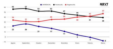Al cierre de marzo, la imagen negativa alcanza su punto máximo del 47%, frente a un soporte de imagen positiva del 39%. La volatilidad del diferencial neto -que pasó de +26 a -8 puntos- refleja una degradación de 34 puntos netos en siete meses. Este comportamiento indica que el núcleo duro del respaldo presidencial tiende al aislamiento, mientras crece el segmento de ciudadanos cuya opinión ha mutado ante la ausencia de resultados tangibles en el bienestar cotidiano.