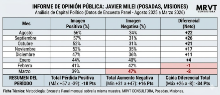 Un monitoreo de opinión pública realizado en Posadas, Misiones, desde agosto de 2025 hasta marzo de 2026 por MRVT Consultora, evidencia un deterioro sostenido en la imagen positiva del presidente Javier Milei.