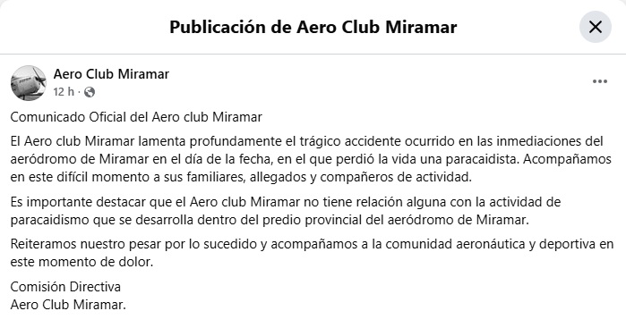 Horas después de la tragedia, el aeroclub emitió un comunicado a través de sus redes sociales donde lamentó el accidente y se desligó de la actividad de paracaidismo que se desarrollaba en el predio.