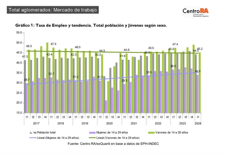 En cuanto a la tasa de empleo, explican que ”para el total de la población se registra en un 44.3% para el primer trimestre de 2024”. Y detallaron: ”En el grupo de jóvenes, la tasa de empleo es significativamente más baja, con un 34% para las mujeres y un 45.2% para los hombres. Si bien la tasa de empleo total muestra una tendencia ligeramente ascendente, el empleo entre los jóvenes se mantiene en niveles relativamente bajos. Las mujeres jóvenes presentan una tasa de empleo menor que los varones jóvenes, lo que refleja una brecha de género persistente en el mercado laboral”.