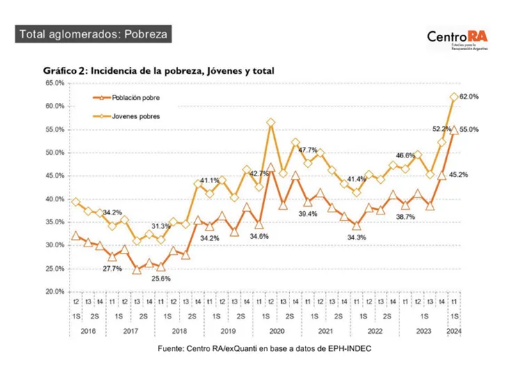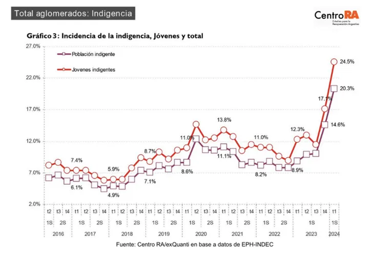 En cuanto a la indigencia, calificaron al indicador de la misma como ”escalofriante”: ”A principios de este año, durante el primer trimestre de 2024, una cuarta parte de la juventud en Argentina se cayó del sistema y vive en la indigencia. Este cruel y grave indicador nunca observó una medición similar. Recordemos que ser indigente significa no lograr cubrir la cantidad de comidas diarias necesarias”, explicaron.