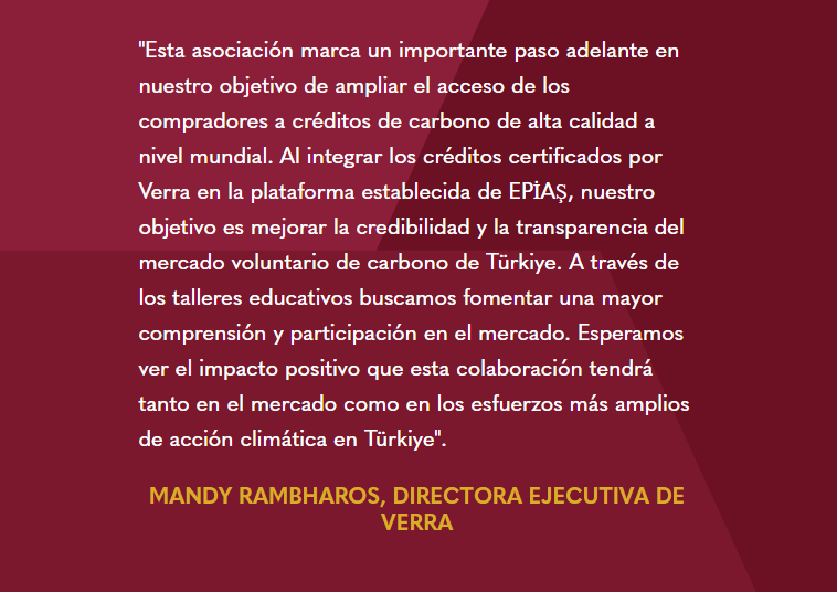 El CEO de EPİAŞ, Taha Meli Arvas, dijo: “Con este acuerdo, nuestro objetivo es proporcionar el primer comercio de créditos de carbono voluntarios basado en bolsa en el mundo, en EPİAŞ. Es decir, una contraparte central conectada a los registros, que verifique la existencia de los créditos y permita su comercialización sin problemas. Este paso aumentará la diversidad de productos de nuestros mercados ambientales, permitiendo a nuestros participantes en el mercado acceder a créditos certificados por Verra”.