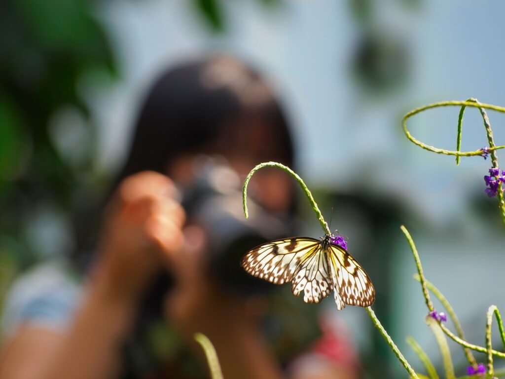 Female photographer taking a photo of a butterfly